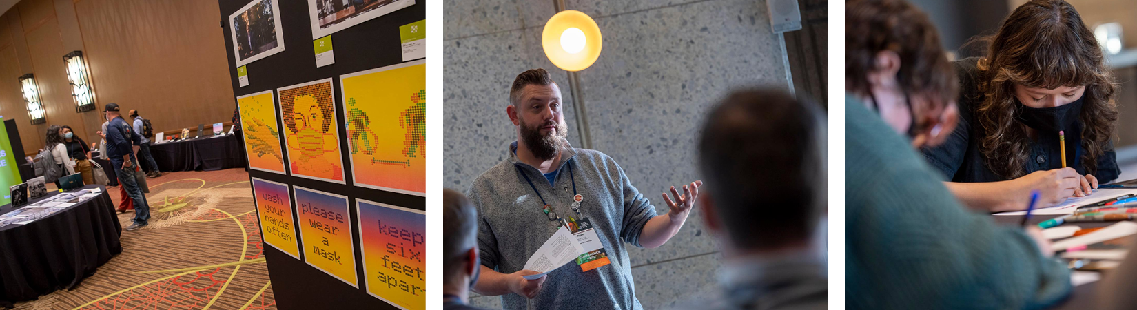 Left to right: 2021 UCDA Design Awards Show; Design Pod presentations; and getting creative during a hands-on activity (photos by Matthew Lester).