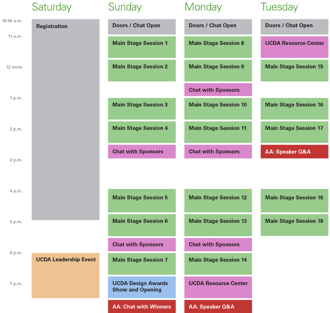 The Conference Pass gets you access to all the scheduled conference main stage live presentations (access to recordings through October 31); the UCDA Design Awards Show and UCDA Design Collection portals; the virtual UCDA Resource Center; participation in the UCDA Foundation Online Auction; a conference swag box; and access to the Help Desk.