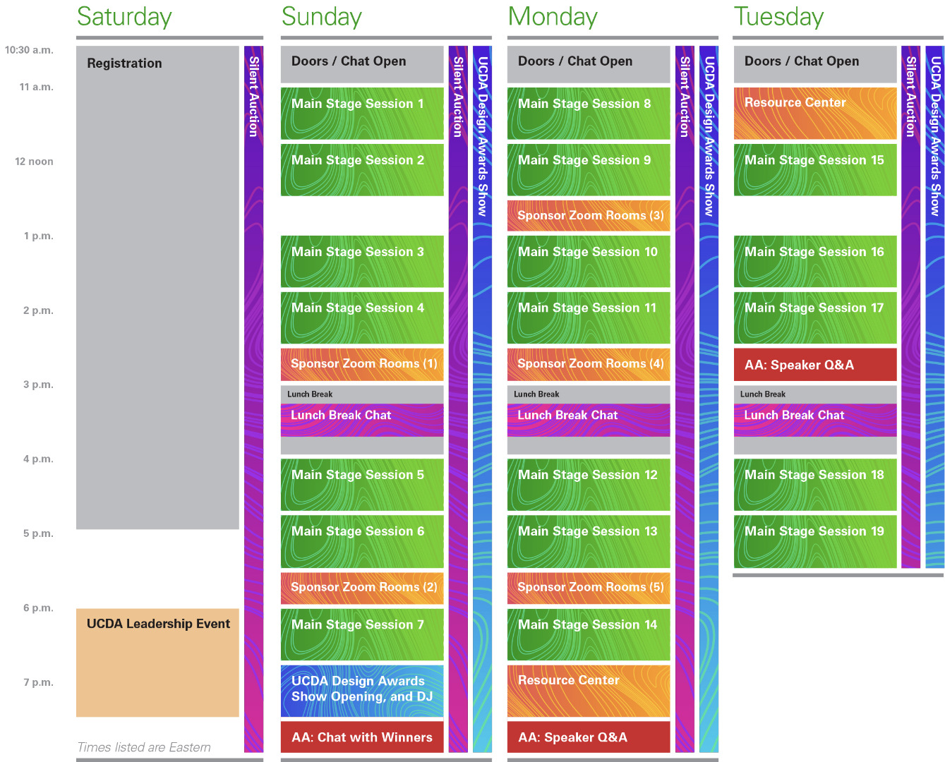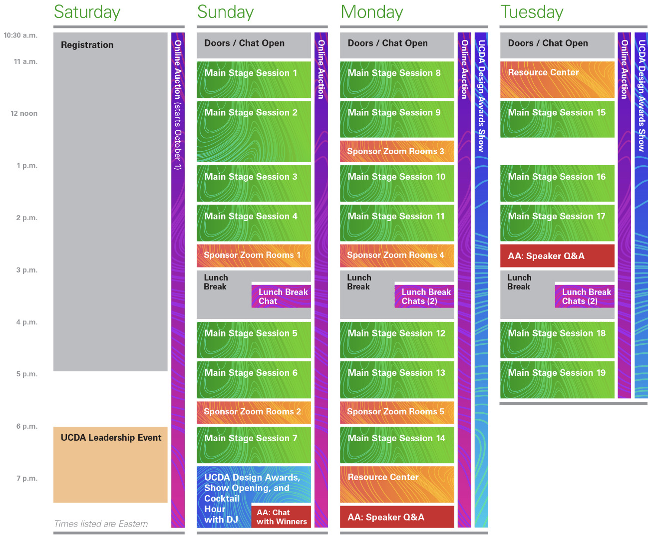 In addition to everything included with the Conference Pass, the All Access (AA) add-on gets you a chat with selected UCDA Design Awards winners (Sunday); a cocktail reception with speaker Q&A (Monday); a speaker Q&A (Tuesday); longer access to the conference main stage presentation recordings (through December 31); and a limited edition conference T-shirt (available to the first 75 who sign up for All Access, shirt sizes are first-come, first-serve)