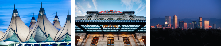 Let to right: Jeppesen Terminal at the Denver International Airport; Denver Union Station (photo by Ellen Jaskol); Denver skyline looking west.