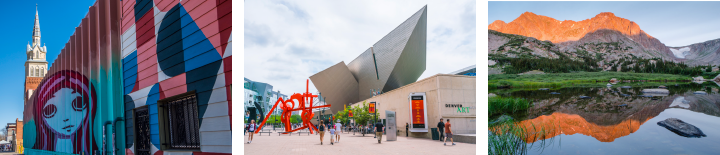 Left to right: RiNo Street Art (photo courtesy Visit Denver); Denver Art Museum; Rocky Mountain National Park (photo courtesy Rocky Mountain National Park).