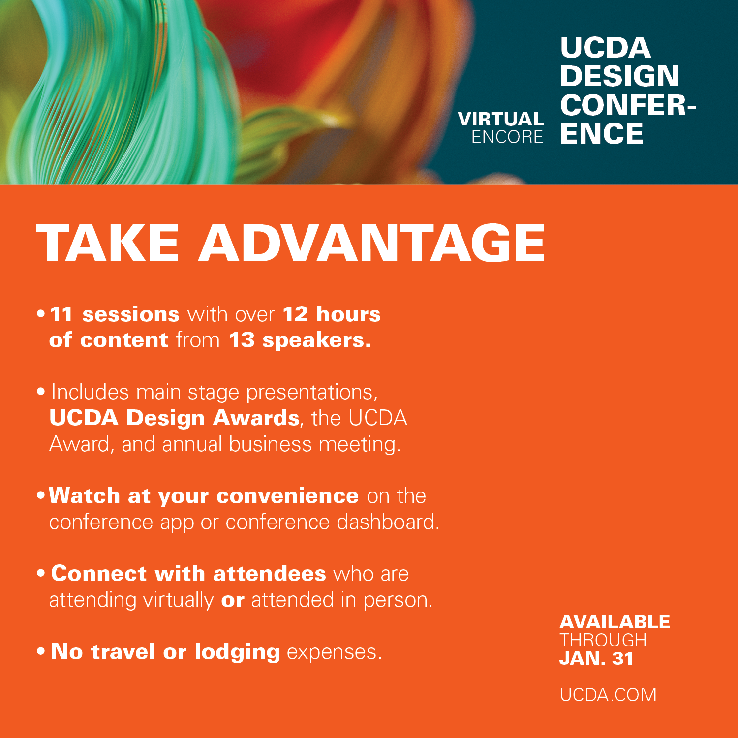 The Conference Pass gets you access to all the conference main stage videos available to watch through January 31, along with access to the UCDA Design Awards portal, networking with attendees (both in-person and virtual), handouts, and resource center contacts.