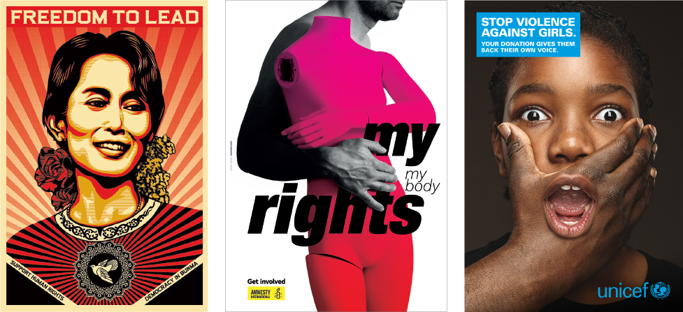 Three of the 100 posters in the Women’s Rights Are Human Rights exhibition (from left to right): Freedom to Lead: Aung San Suu Kyi by Fairey Shepard; My Body My Rights by Wein Ewa; and Stop Violence Against Girls by Saatchi & Saatchi Zürich.