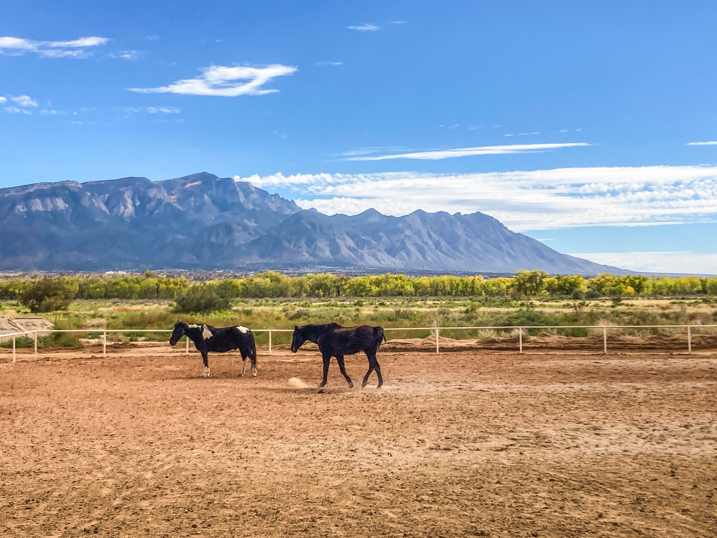 While walking through the Stables at Tamaya, I captured this photo of two rescue horses and the Sandia Mountain landscape.